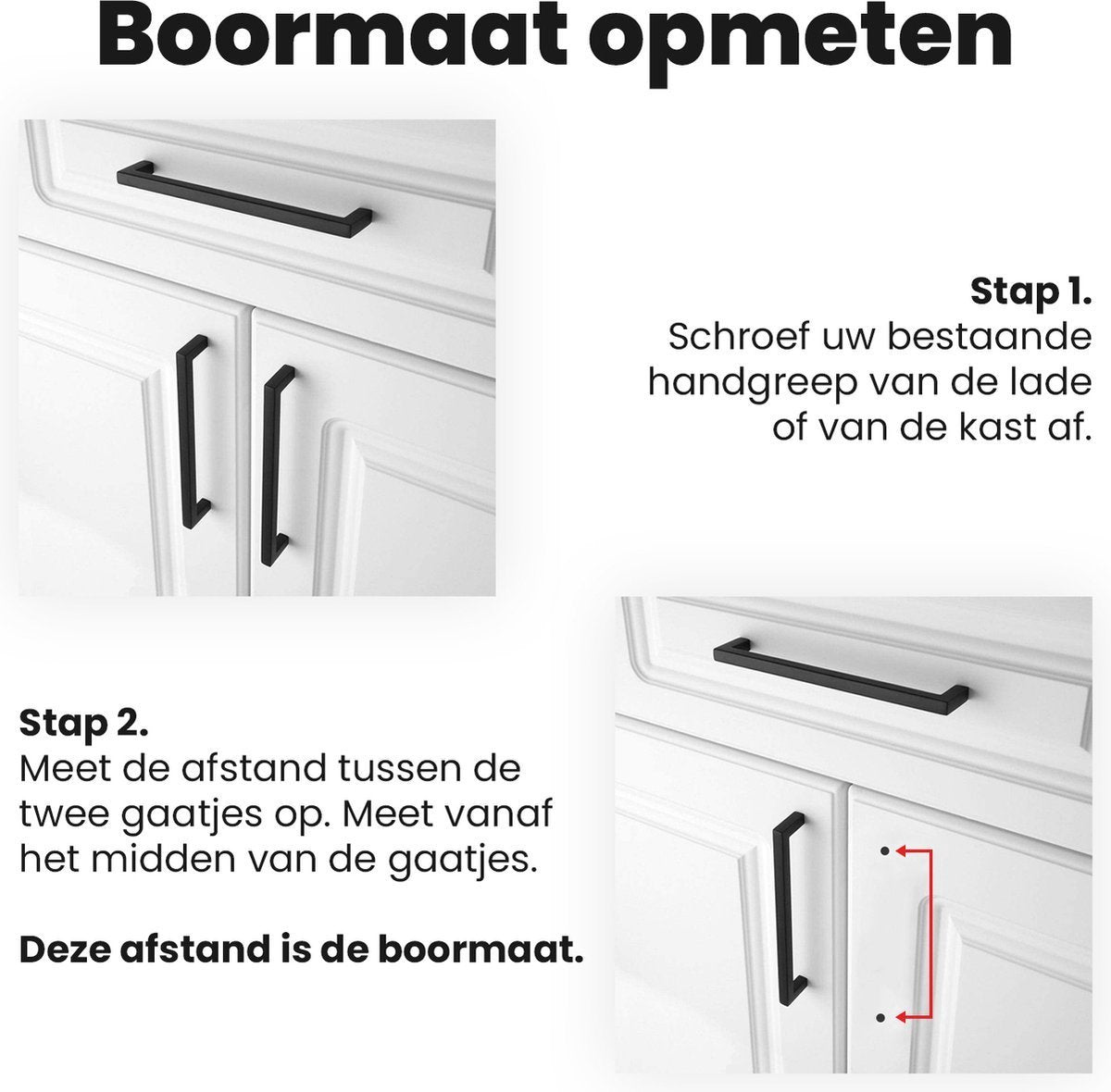 Deze afstand wordt vanuit het midden van het gaatje gemeten. Je kunt zelf gaatjes boren, of de bestaande gaatjes gebruiken van de huidige handgrepen als deze de juiste afstand hebben.