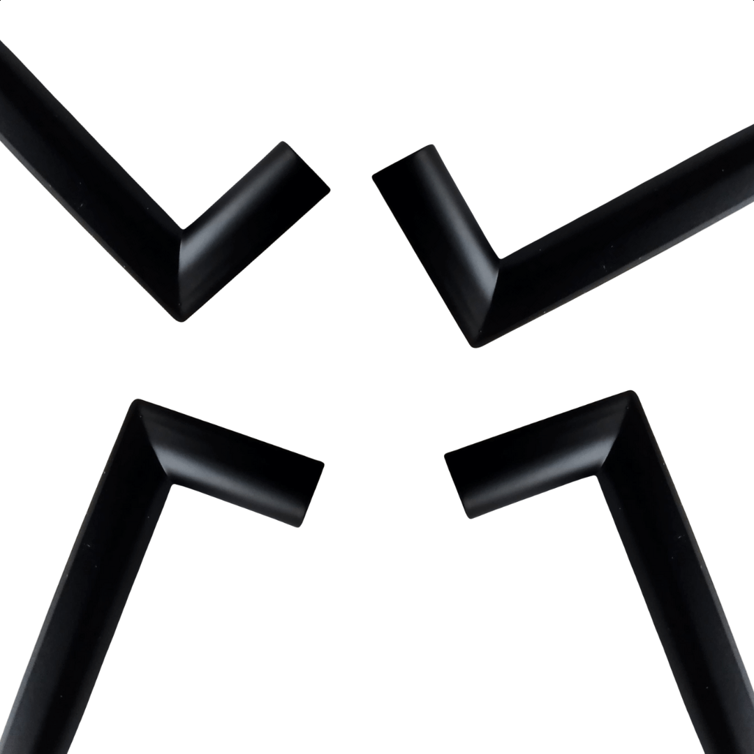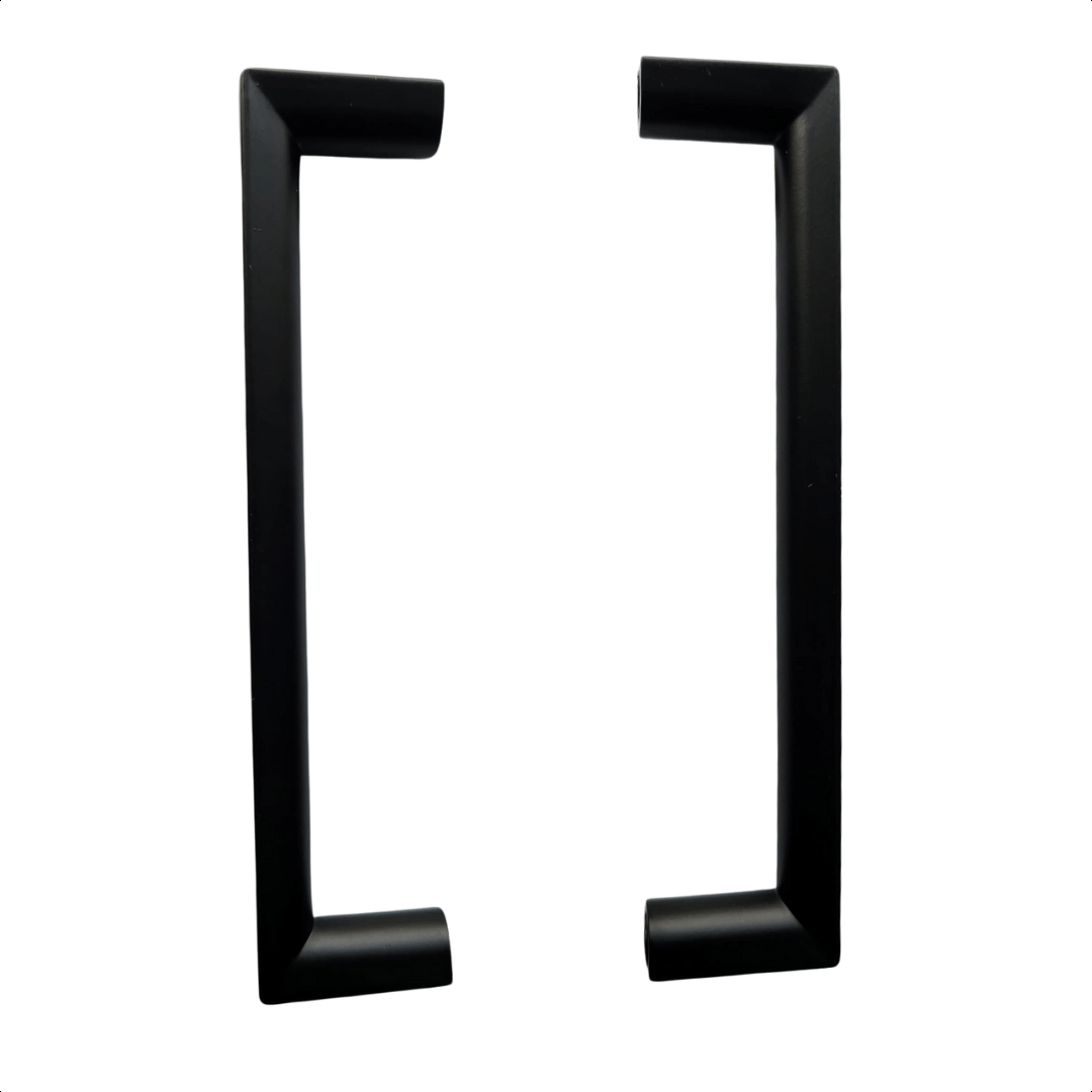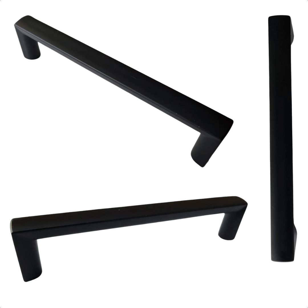Een complete set van 10 kunststof zwarte meubelgrepen.
