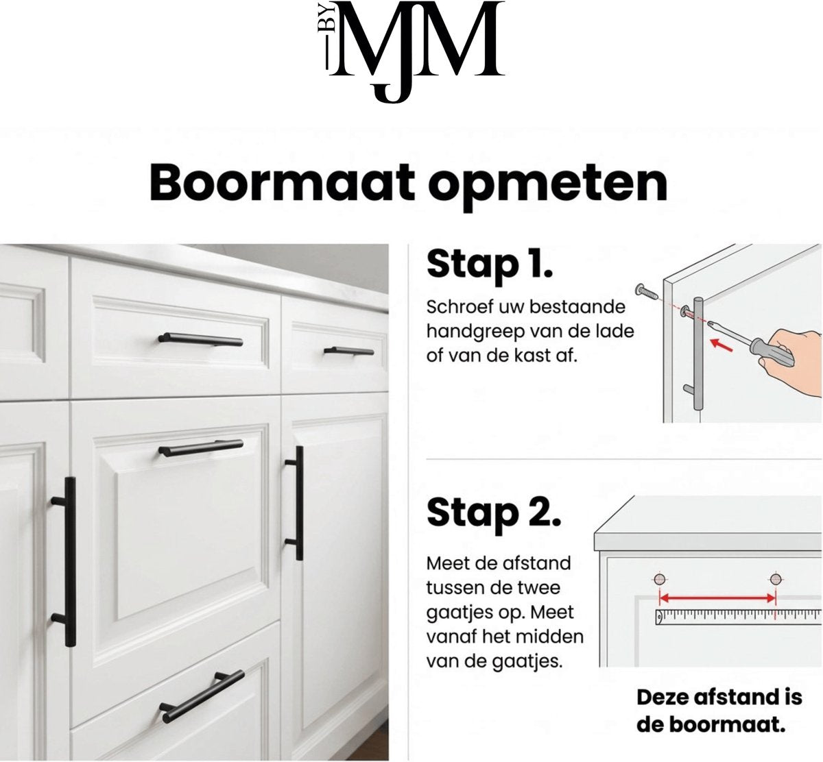 Tip van Michel: "Meten is weten. De boormaat (ook wel hart-op-hart of steekmaat genoemd) is de afstand van het midden van het ene boorgat tot het midden van het andere gat. Vervang je bestaande grepen? Meet dan heel nauwkeurig de huidige afstand op, zodat de nieuwe greep precies op de bestaande gaten past."