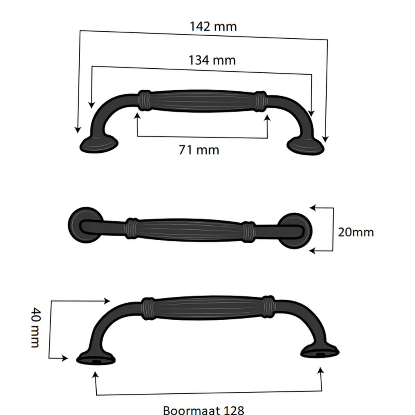 Dit is de afstand tussen de gaatjes op de lade of deur waar je de handgreep uiteindelijk op wilt monteren.
